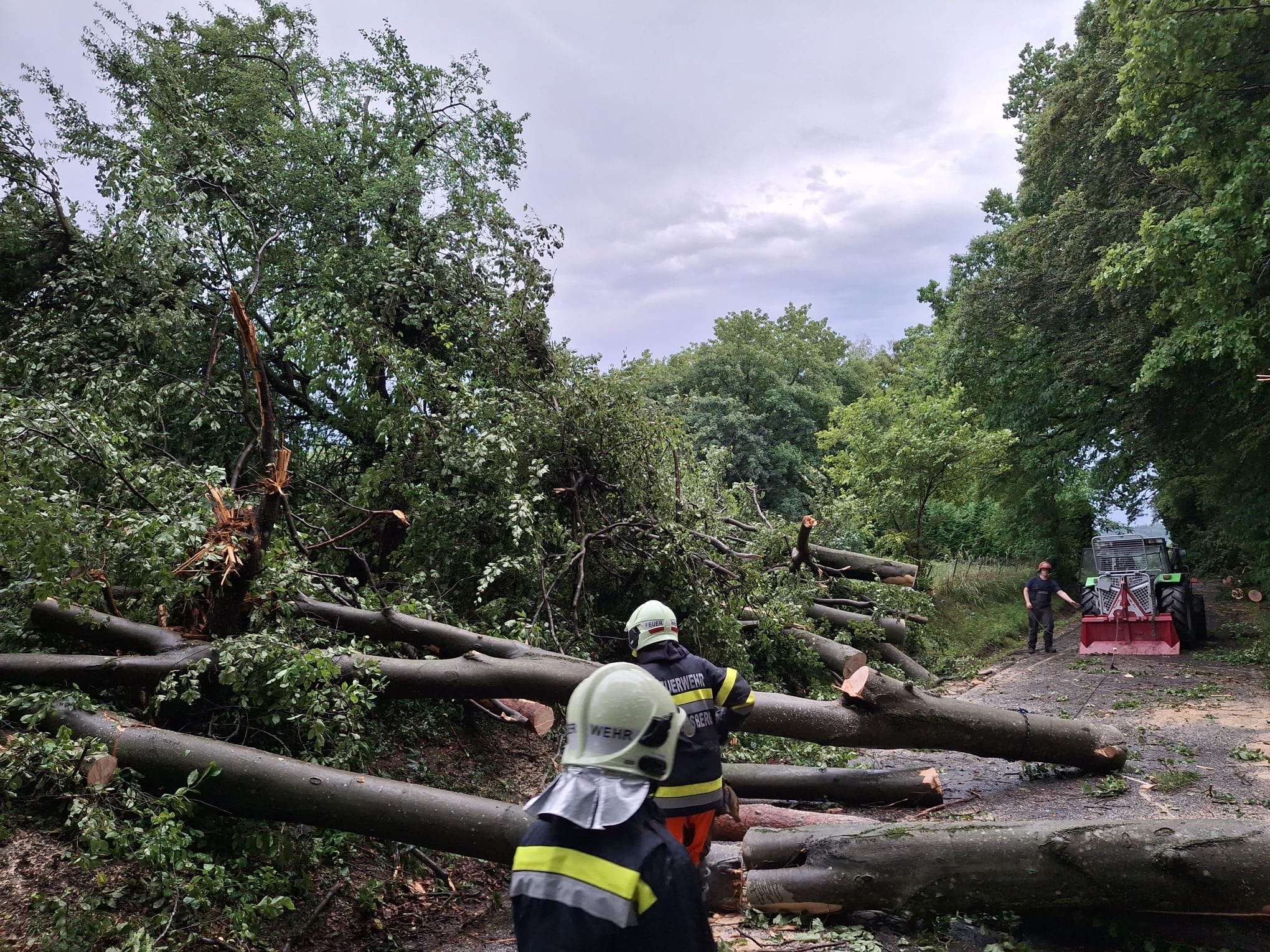 In kürzester Zeit zog ein gewaltiger Sturm über das Gemeindegebiet, welcher das Schadenausmaß bei vielen Florianis bereits erahnen ließ. Viele Notrufe über die Feuerwehrnotrufzentrale sowie telefonisch gingen gleichzeitig ein, dass viele Straßen im Ortsgebiet nicht mehr passierbar sind. Beim Eintreffen der ersten Kräfte im Feuerwehrhaus ging eine Meldung ein, dass eine Person von einem Baum getroffen und eingeklemmt ist. Umgehend rückten wir mit dem ersten Einsatzfahrzeug zur Einsatzadresse aus. Dieses mussten auf der Anfahrt bereits Bäume von den Verkehrswegen entfernen, um die Zufahrt für die Rettungskräfte zu ermöglichen. Vor Ort wurde festgestellt, dass eine Person von einem umgestürzten Baum getroffen und schwerst verletzt eingeklemmt war. Mittels Motorkettensägen, Trennschleifer – um die ebenfalls auf die Person gestürzte Markise – sowie einem Hydraulikstempel konnte die Person befreit werden. Diese wurde dem anwesenden Notarzt zur Hospitalisierung übergeben. Zeitgleich ging ein weiterer Notruf ein, dass an einer anderen Adresse mehrere Personen von einem umstürzenden Baum verletzt wurden. Auch hier wurden Fahrzeug der Feuerwehr von beiden Straßenseiten entsandt. Nachdem sich die Einsatzkräfte über eine Dreiviertelstunde von beiden Seiten zum Einsatzort „freischnitten“ konnten Entwarnung gegeben werden – keine Personen verletzt.